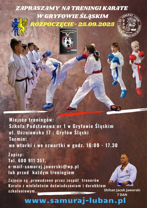 Z dniem 07.04.2025 roku otworzyliśmy nową Sekcję Karate Gryfów Sląski, w ramach Centrum Szkoleniowego Sztuk Walk, Strzelectwa i Ochrony Samuraj. Wszystkich chętnych serdecznie zapraszamy...