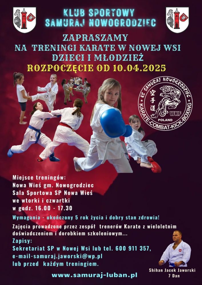 Z dniem 10.04.2025 roku otworzyliśmy nową Sekcję Karate Nowa Wieś, w ramach Centrum Szkoleniowego Sztuk Walk, Strzelectwa i Ochrony Samuraj. Wszystkich chętnych serdecznie zapraszamy...