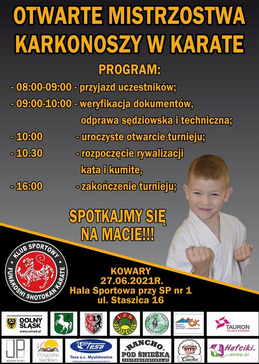 W dniu 27.06.2021 r. w Kowarach odbędą się Otwarte Mistrzostwa Karkonoszy w Karate. Wszystkich chętnych prosimy o zgłaszanie się do sensei Tomasza Podbuckiego podczas zajęć lub telefonicznie tel. 886780028.