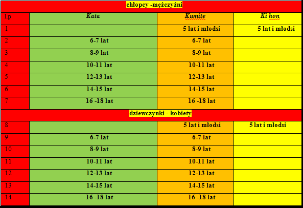 Konkurencje kata i kumite z podziałem na płeć będą rozegrane w przedziałach wiekowych: